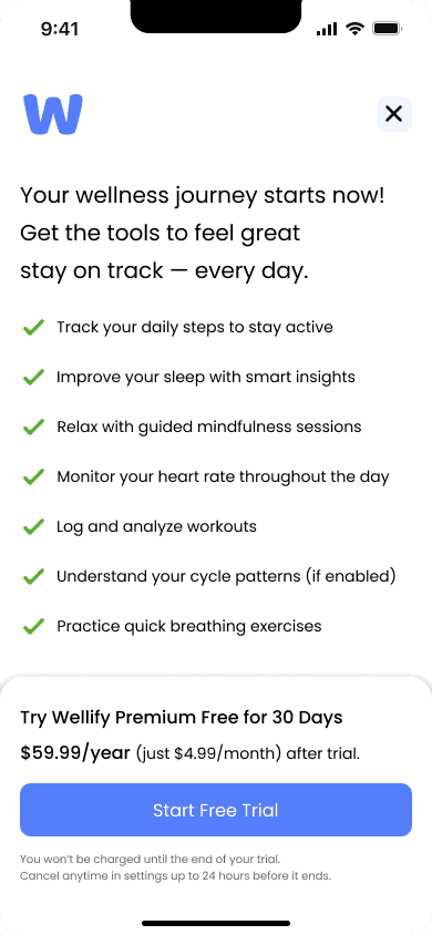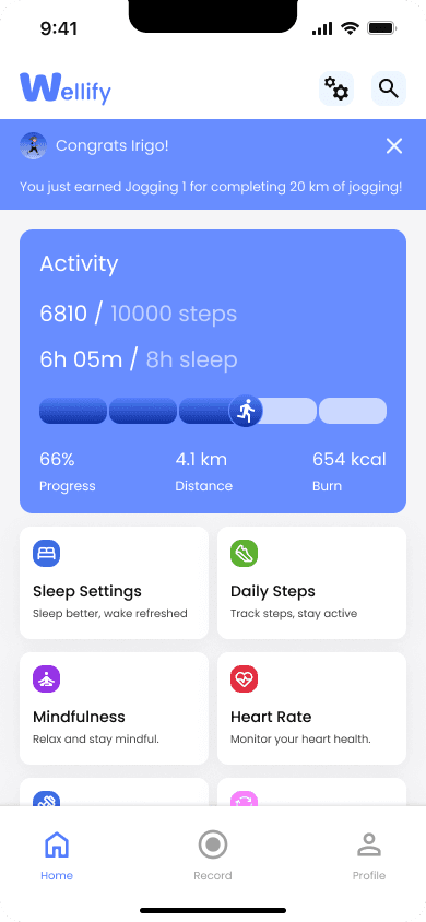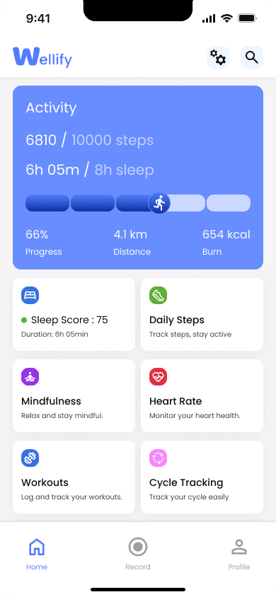 Wellify is a mobile app for tracking daily activity, sleep, and habits. It connects to fitness trackers, visualizes progress, and helps users stay consistent through clear goals and simple gamification.